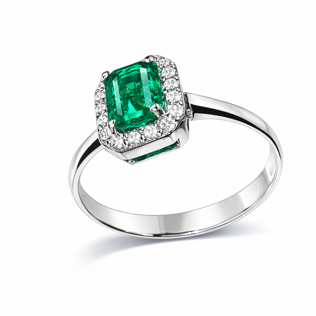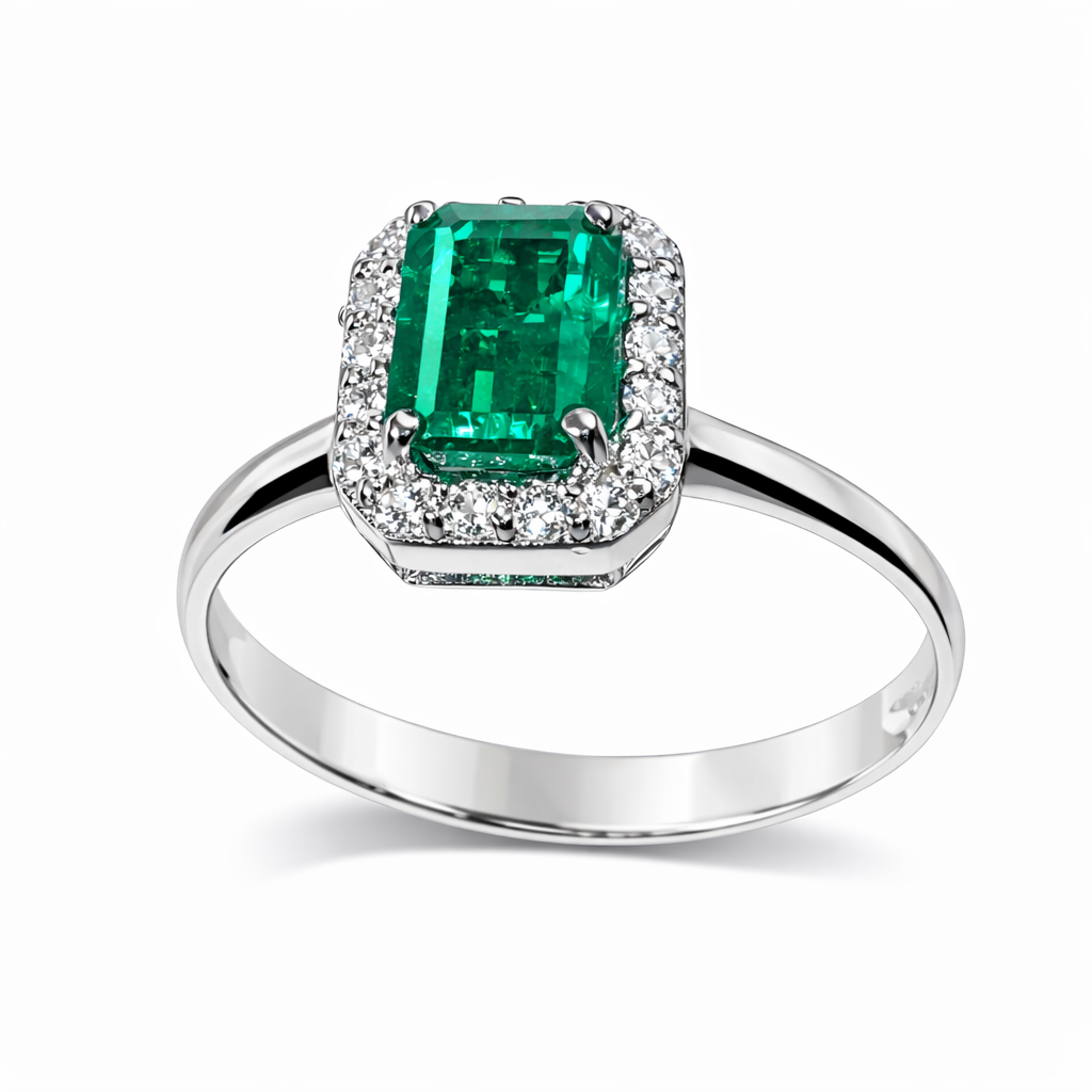 Pierścionek Hermitage ze szmaragdem i diamentami z 18K białego złota r.15